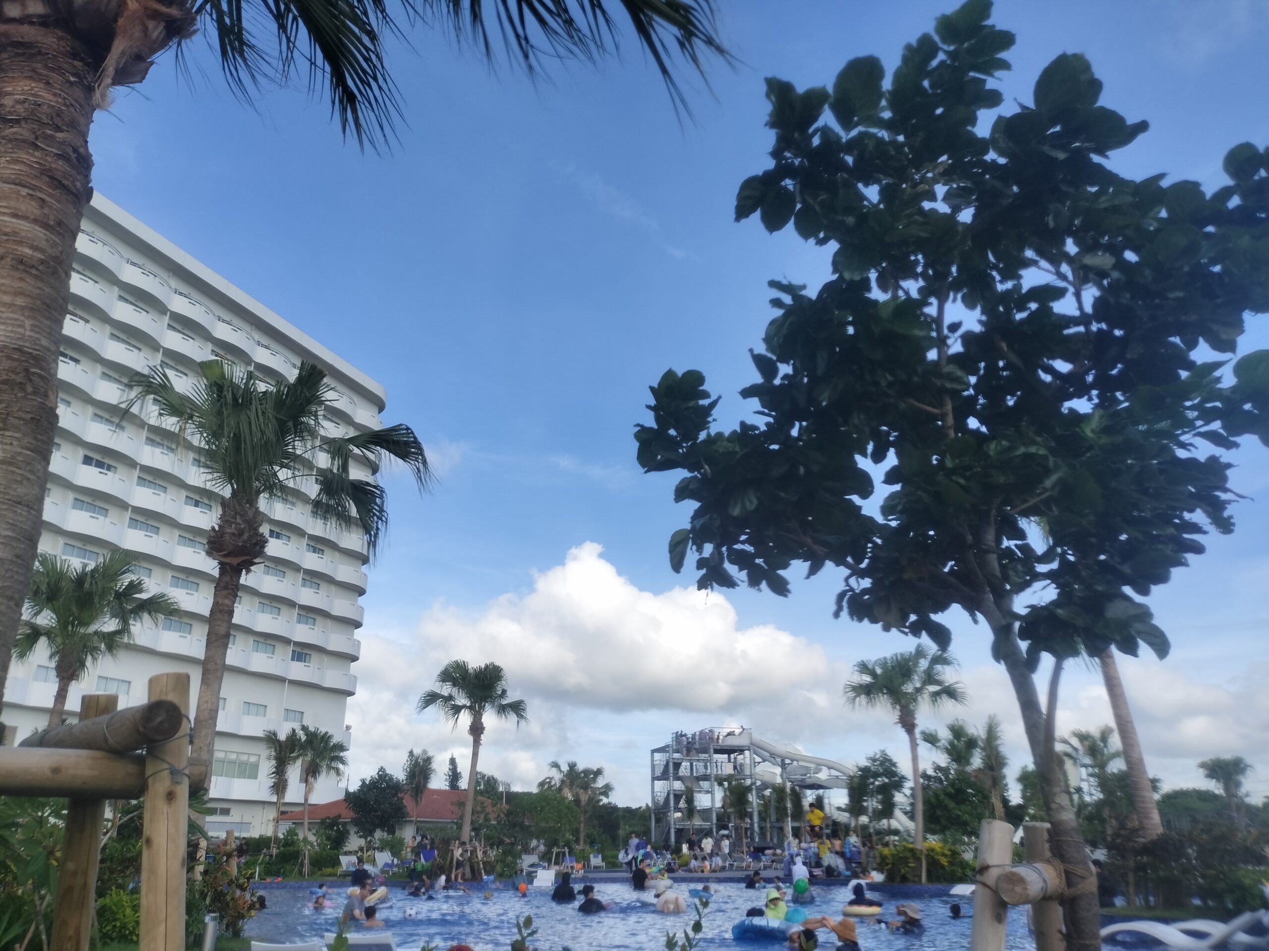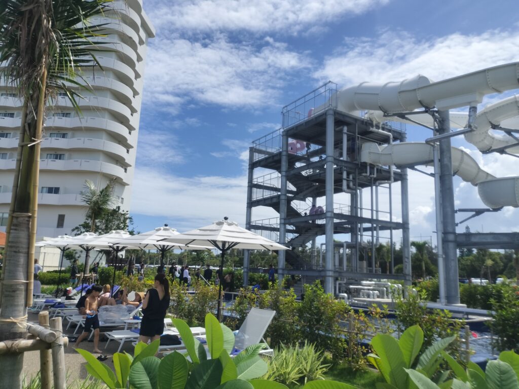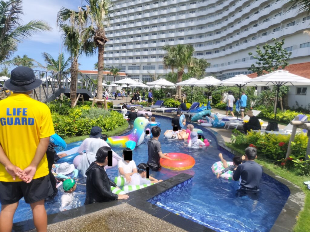 グランドメルキュール沖縄残波岬リゾートでは夏休み期間中でもガラガラ。デッキチェアも余っている状態だったのでカップルには良さそう。 - 混雑具合:夏休み中にも関わらず不快感になるほどは混んでいなかった。流れるプールも人は多いもののみんなで流されるので人が邪魔になるほどではない。が、週の後半になるにつれ明らかに人が増えて行ったので金~日あたりはそこそこ混雑が予想される。