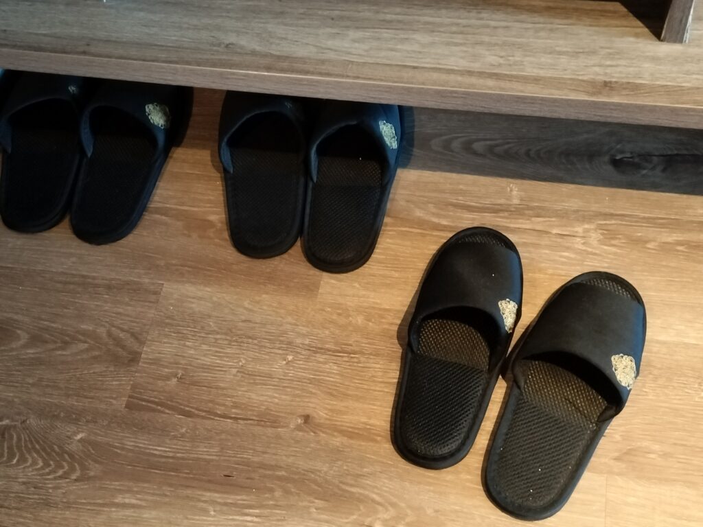 使い捨てのスリッパではなく、メッシュっぽい生地なので生地の間に砂などのゴミが溜まっていてちょっと気持ち悪いです。部屋内はビーサンかスリッパを持参した方が良いかもです。