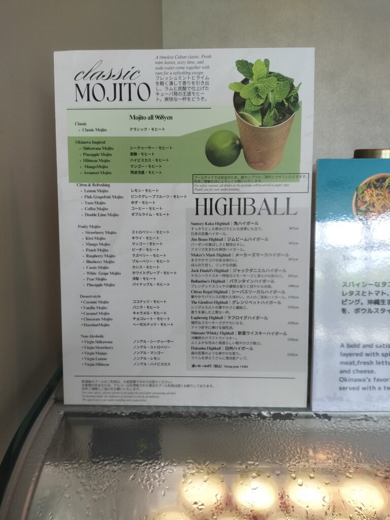 混みあっていましたが、2-3分待てば大体の物は順番が回って来た気がします。オリオンビールに至っては待ち時間0分ばかりでした。ソフトドリンクとお菓子は並んでいました。飲み物もお菓子も全て部屋やプールサイドに持っていけるので便利です。おかげで滞在中は一度もお金を使いませんでした。でもなんだろ、オリオンがいつもすっぱい感じだったんですよねぇ。紙コップで飲んでるからかな~そのあと居酒屋で飲んだオリオンの方が何倍も美味しかったです。 - 外国人のマナーが気になる